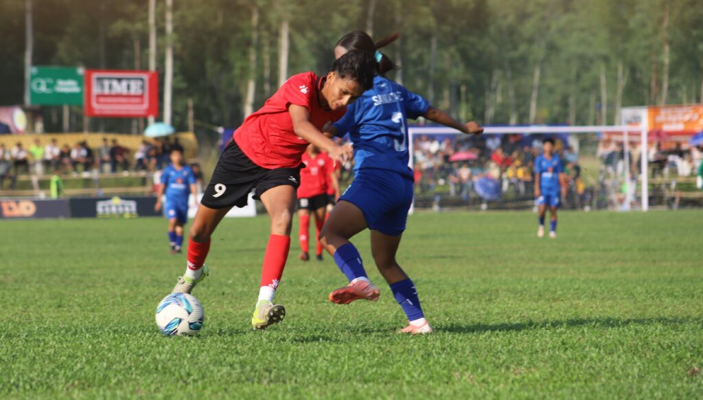 फोटो ः प्रतिस्पर्धा गर्दै नेपाल पुलिस क्लव रातो जर्सी र संकटा क्लव हरियो जर्सीमा