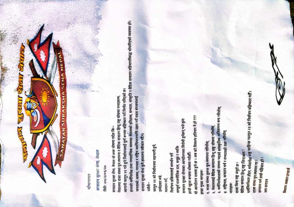 गत फागुन १९ गते कनकाई पुलमा भेटिएको प्रेसर कुकर बमको साथमा भेटिएको झोलामा फेला परेको पर्चामा सनातन सुुुरक्षा सेना नेपालको पर्चामा नेपालमा राजसंस्था स्थापना, वैदिक सनातन हिन्दु राज्य घोषणा र फागुन २१ गतेको निर्वाचनलाई पुर्णरुपमा बहिस्कारको नारा राखिएको थियो । पर्चामा फागुन २१ गतेको निर्वाचनमा सहभागि हुने पार्टी र संस्था आफ्नो आन्दोलनको विरोधी हुने कुरा उल्लेख छ । अबको विकल्प हतियारनै भएको समेत पर्चामा लेखिएको थियो ।