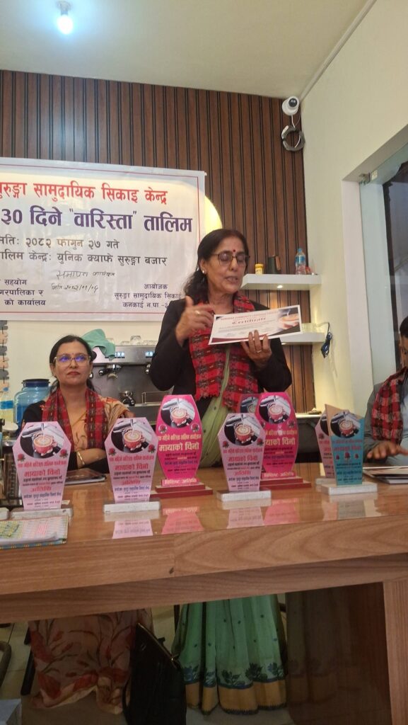 सुरुङ्गा सामुदायिक सिकाई केन्द्रको आयोजना तथा कनकाई नगरपालिका र कनकाई नगरपालिका वडा नम्बर ३ को आर्थिक सहयोगमा यहाँस्थित २९ जन युवा युवतीहरुका लागि निशुल्क एक महिने कफि बनाउने वारिस्टा तालिम सम्पन्न भएको छ ।